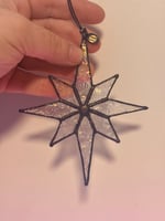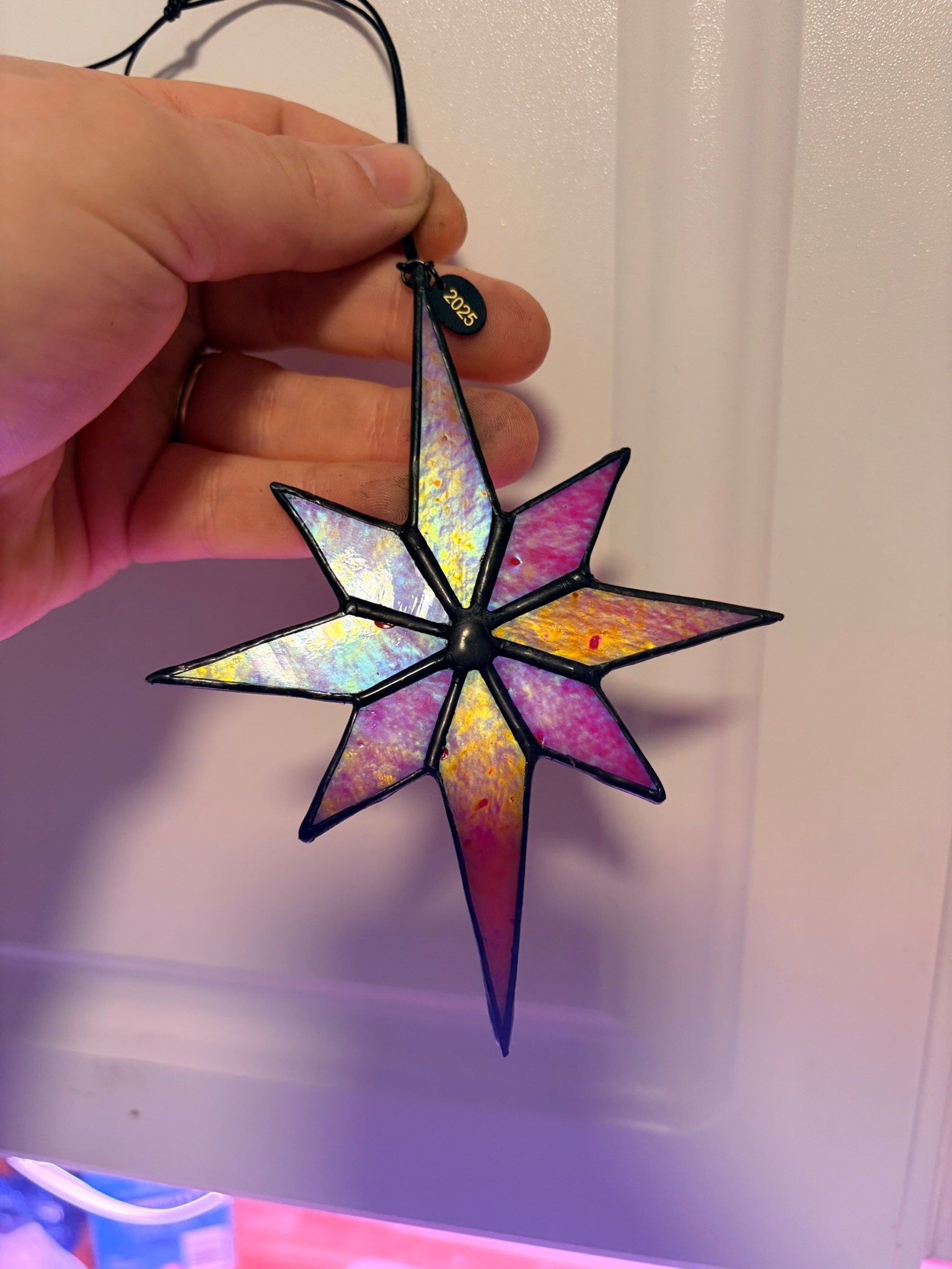 Ornament is 5x4 inches. It is hung with a leather string and is adorned with a special "Mad Glass - 2025" charm. This piece is beautifully boxed, making it perfect for gifting!
